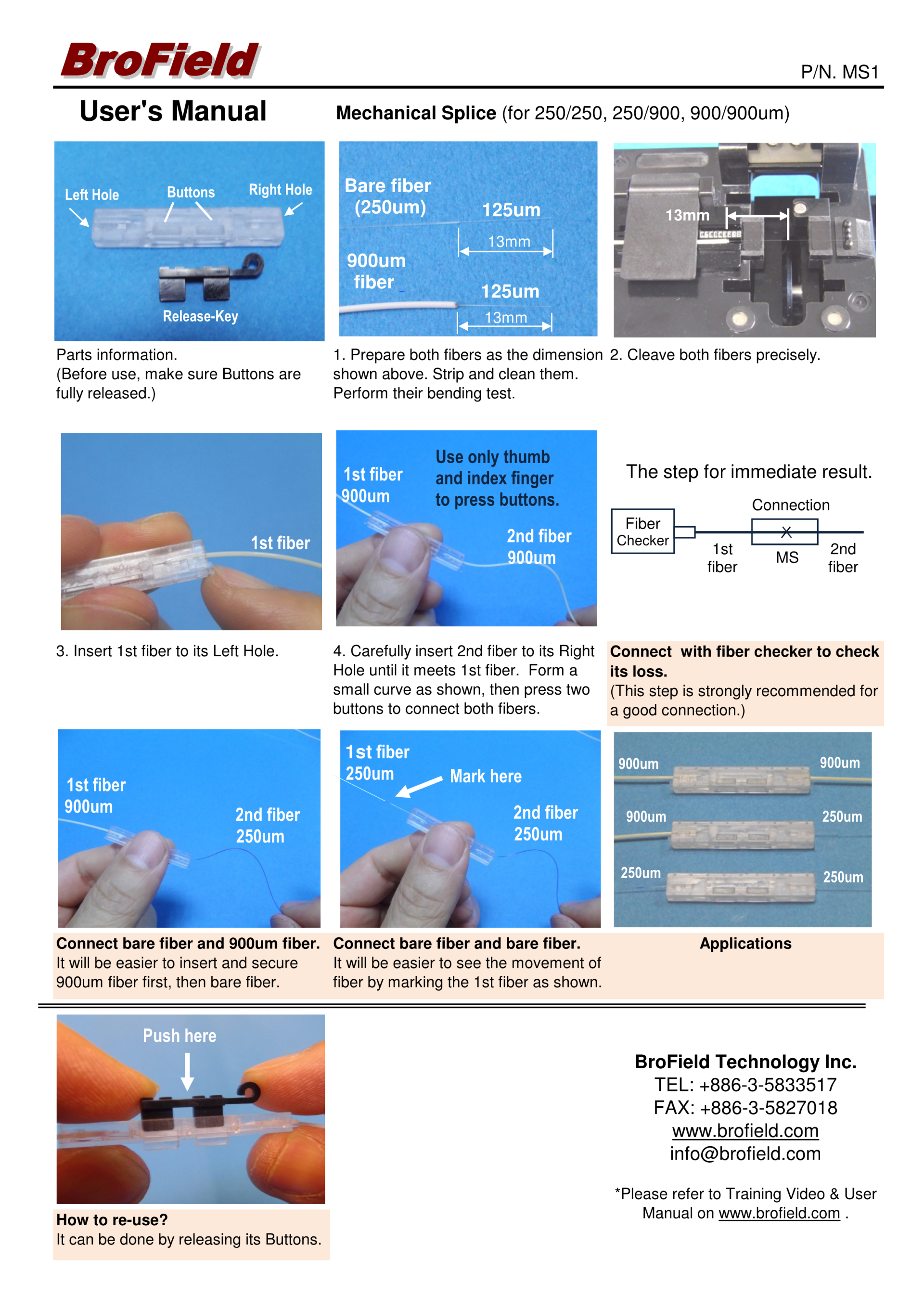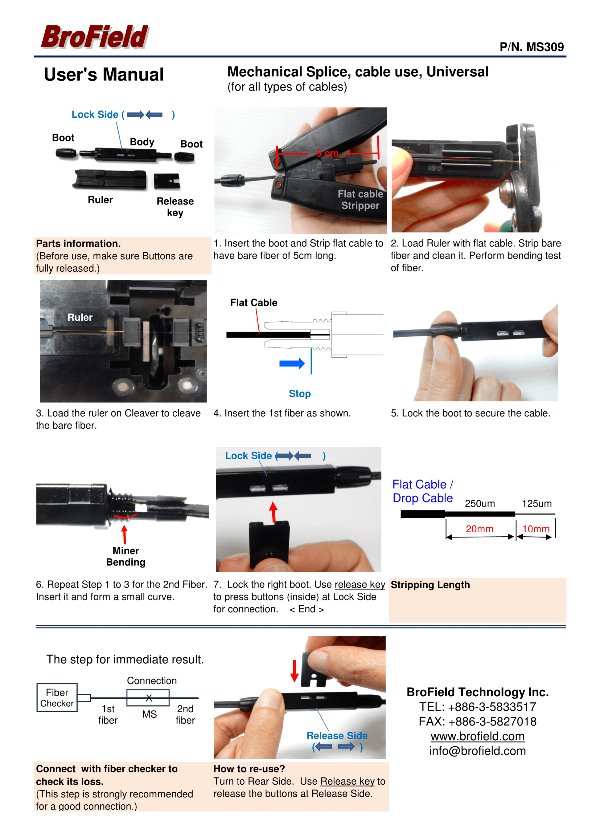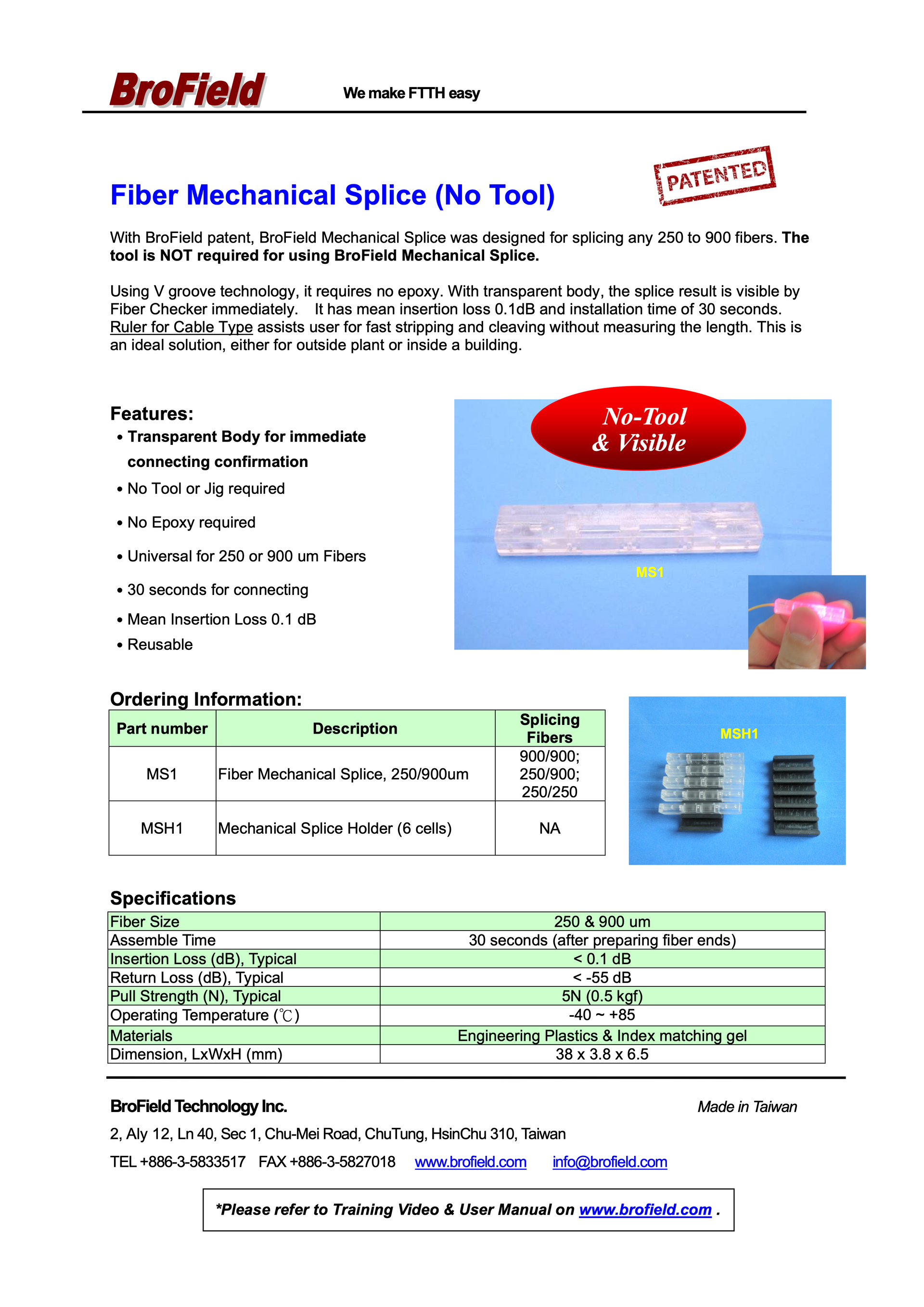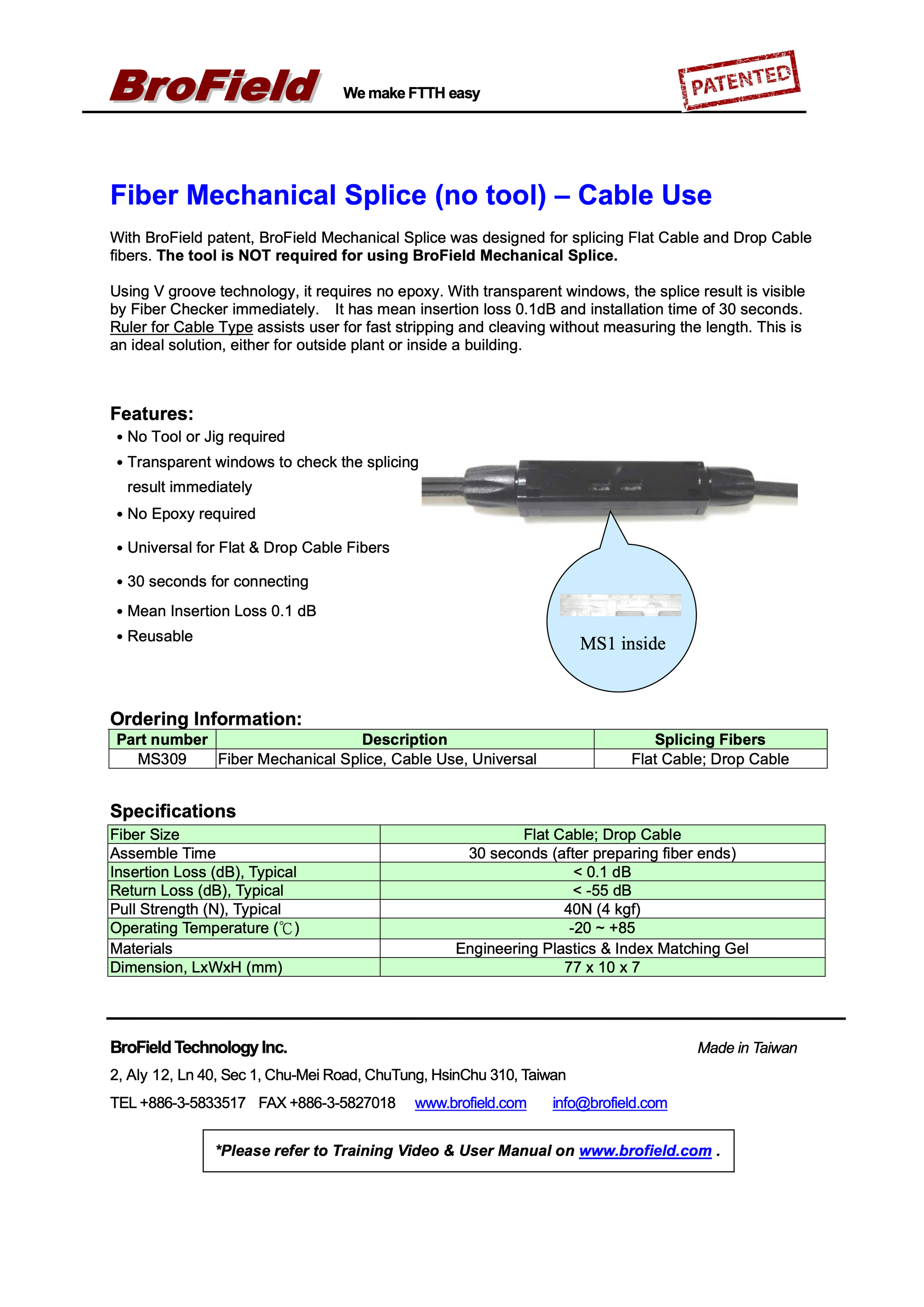 The patented BroField Fiber Mechanical Splice is designed to splice any fiber ranging from 250um/900um or Cables. It is a fast and easy-to-use solution for both outdoor plant and indoor installation.