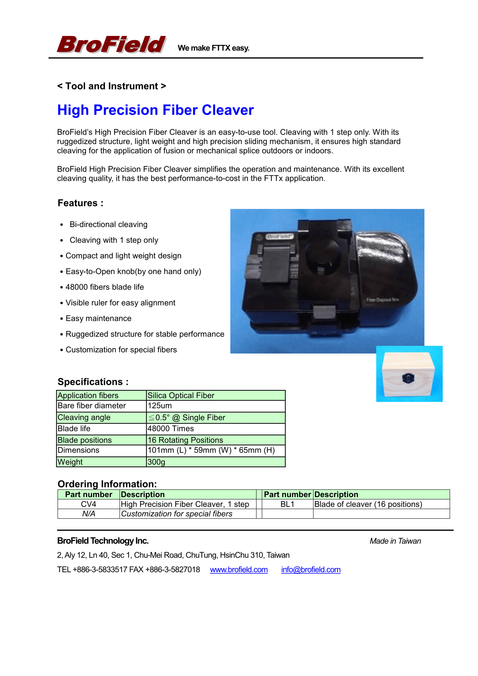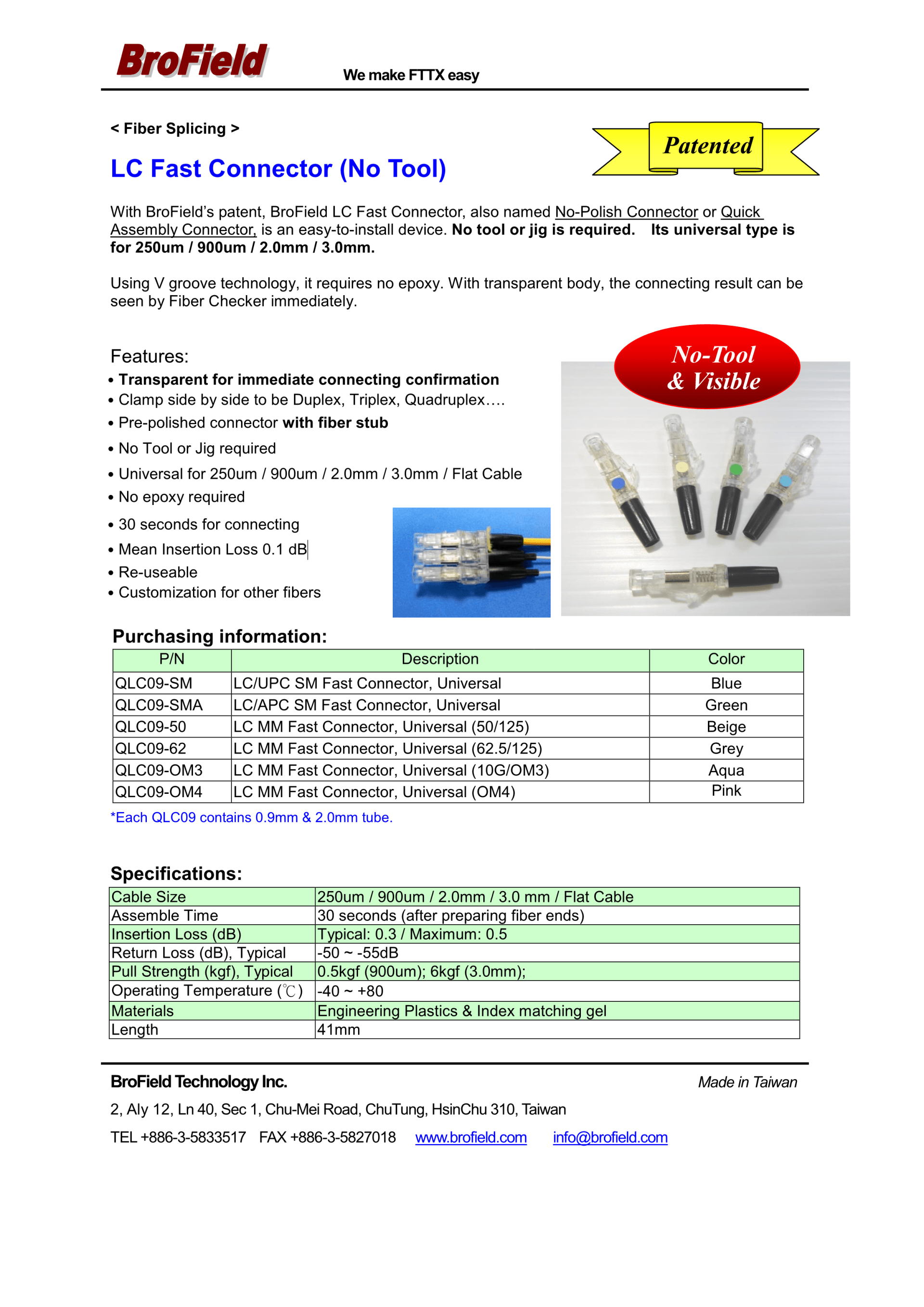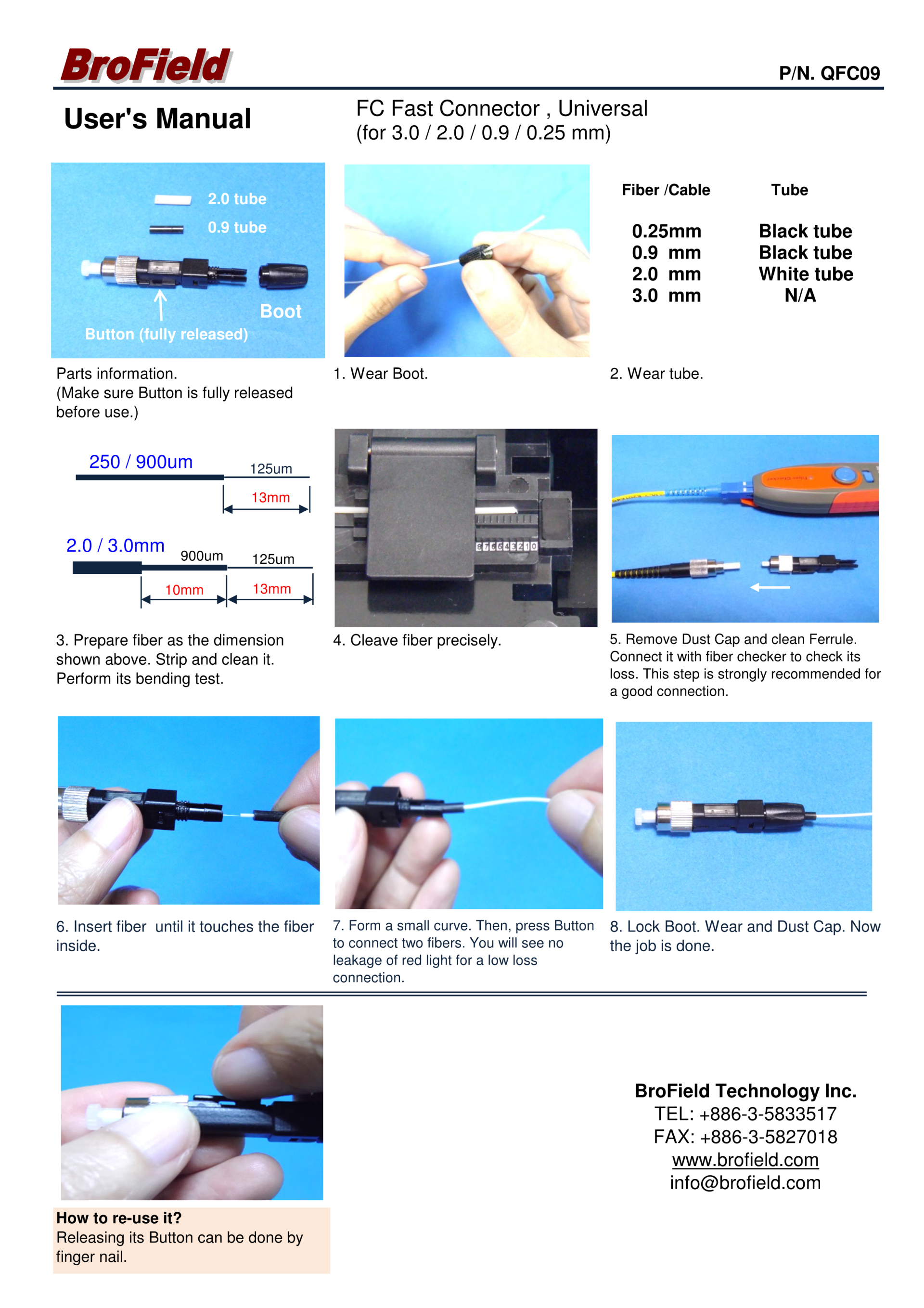 The patented BroField Fiber Fast Connector is designed to connect any fiber ranging from 250um/900um or Cables. It is a fast and easy-to-use solution for both outdoor plant and indoor installation.